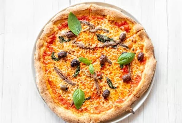 Tomato sauce, fior di latte, anchovies, olives, basil & oregano.