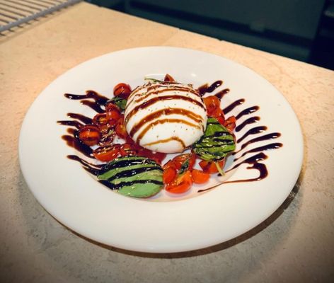 Marinated cherry tomato with balsamic glaze topped with oregano, basil, extra virgin olive oil.