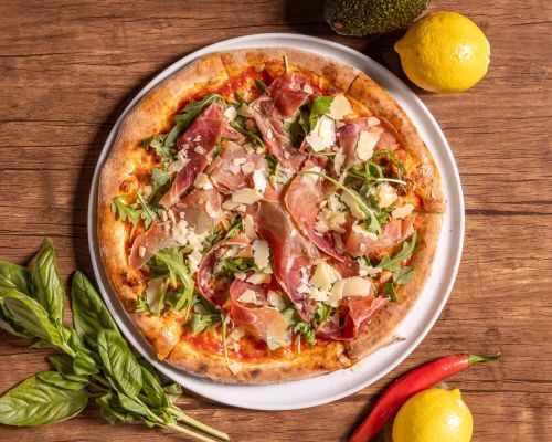 Tomato sauce, fior di latte, prosciutto, rocket, shaved parmesan, EVOO & oregano.