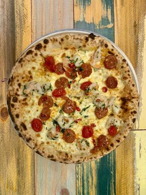 Tomato sauce, fior di latte, prawns marinated with garlic, calamari, mussels meat & parsley.