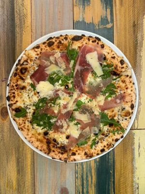 Truffle paste, fior di latte, thinly sliced prosciutto, rocket, shaved parmesan & EVOO.